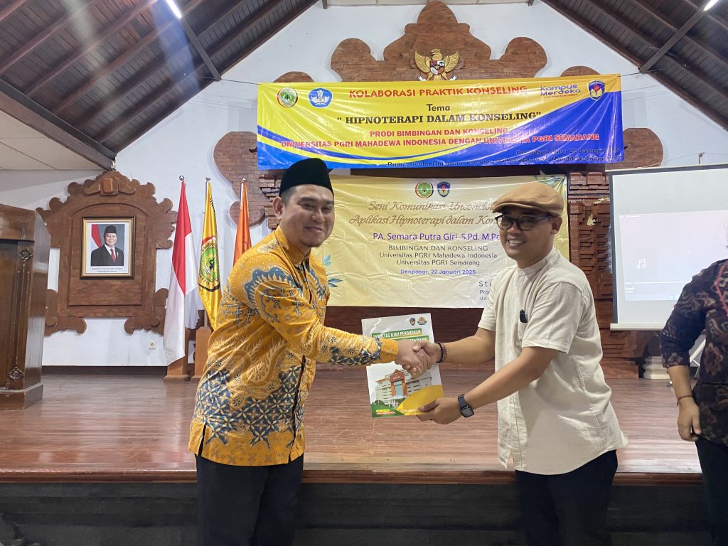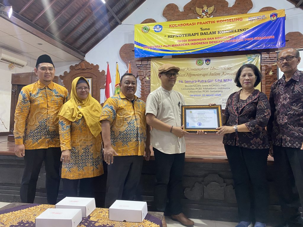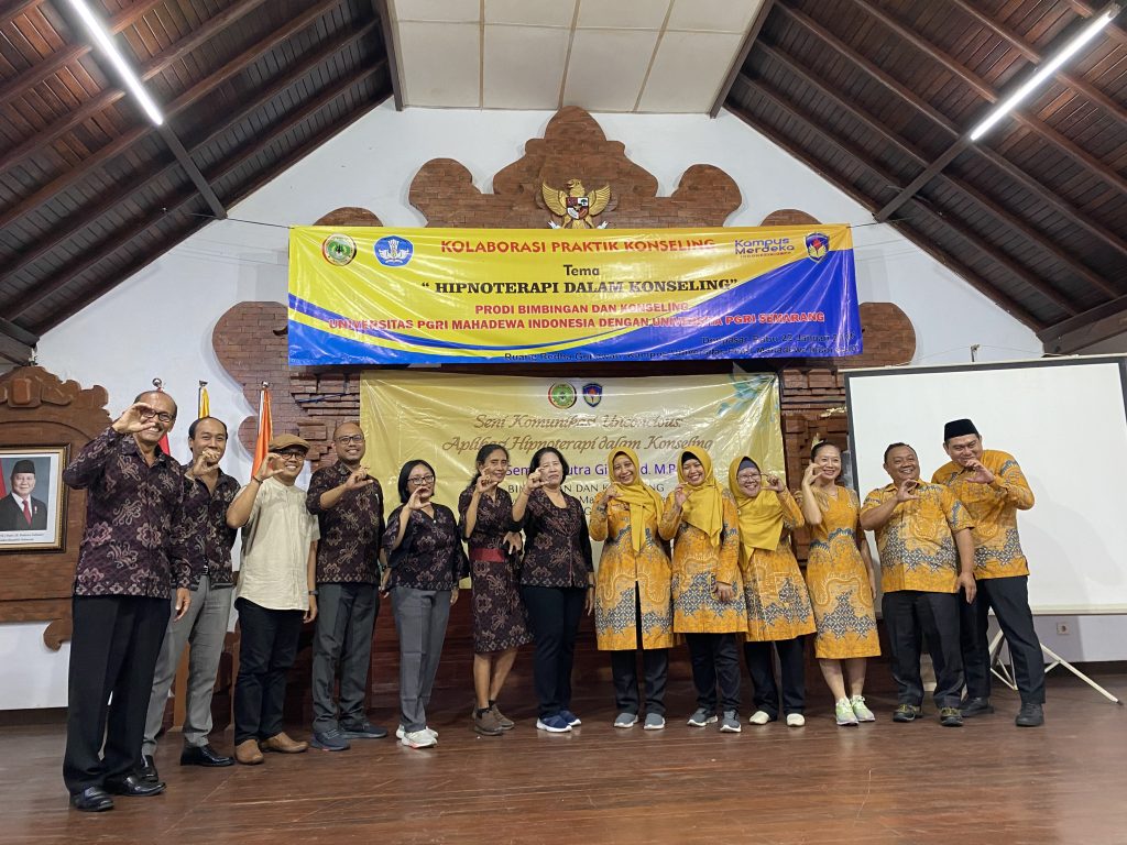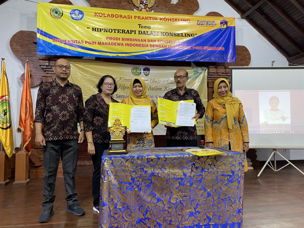 Bertempat di Gedung Redha Gunawang Universitas PGRI Mahadewa Indonesia, Fakultas Ilmus Sosial menerima kunjungan dari Program Studi Bimbingan dan Konseliong Universitas PGRI Semarang, dalam kunjungan ini Program Studi Bimbingan dan Konseling FIS UPMI dan Program Studi Bimbingan dan Konseling UPGRIS Melaksanakan beberapa Kegiatan dianataranya ; 1. Kegiatan Praktik Koseling dengan Tema Hipnoterapi Konseling, 2. Kuliah Umum dengan Tema Konseling Lintas Budaya, kemudian ditutup dengan 3. Penandatanganan Kerjasama diantara Kedua Program Studi, dalam kegiatan ini di Hadiri Oleh, Dekan Fakultas Ilmu Sosial, Ni Luh Putu Tejawati, Wakil Dekan I Made Mahaardika, dan Ketua Program Studi Bimbingan dan Konseling Bapak I Nyoman Rajeg beserta Dosen dilingkungan Prodi Bimbingan dan Konseling, Kemudian dari UPGRI dihadiri oleh Wakil Dekan, dan Ketua Program Studi Beserta beberapa Dosen dan Staf. pelaksanana kegiatan ini berlangsung dari pukul 09.00 wita sampai dengan pukul 16.00 wita, yang berlangsung secara hikmat dan kekeluargaan.